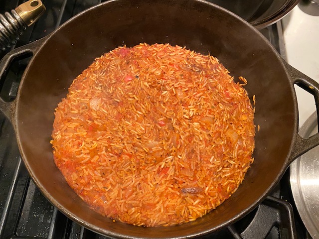 The Jollof Rice, made with Thai jasmine rice, was spicy and delicious with a sharp ginger bite that distinguished it from my beloved jambalaya. Like jambalaya, Jollof Rice is party food, meant to be served to a large group of people. I will definitely try it again. Maybe, when things are more normalized, I will invite folks over for a jambalaya/Jollof taste test, not unlike my own Jazz Fest experiments.