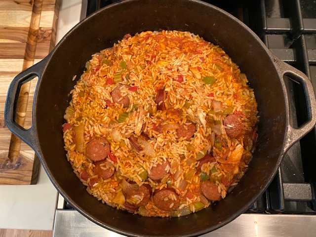 I recently made the perfect jambalaya! Why was it perfect? Because it tasted just like the jambalaya I have been served so many times in New Orleans at large family gatherings, often during Carnival but also year round, including even the Marriott-managed cafeteria at Loyola University. The special trick behind the perfectness of this jambalaya – precisely following Tom Fitzmorris’ recipe, including using Uncle Ben’s parboiled rice.